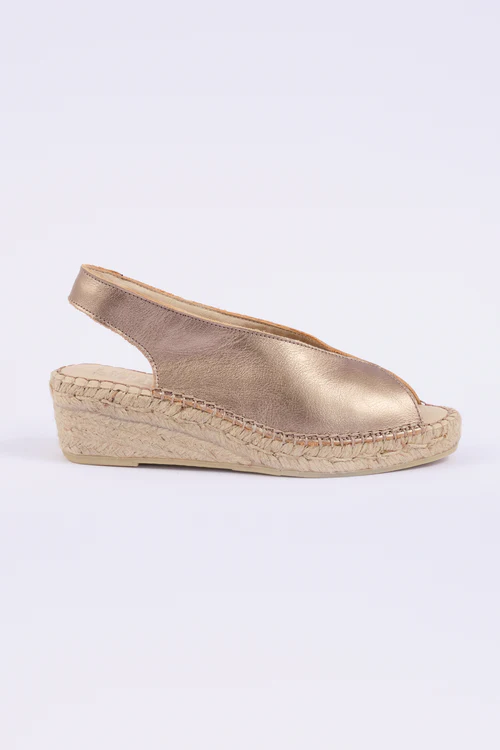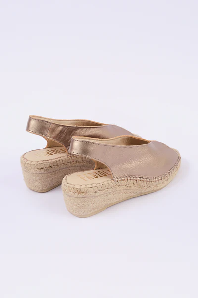 Sandalia abierta de cuña media con puntera redonda elaborada en laminado bronce. Salón con puntera abierta, con elástico para ajustar sobre el tobillo. Piso de yute natural de un total de 5 cm. Diseñado, fabricado y cosido todo en España, cómodas, con suela antideslizante y ligeras de peso.