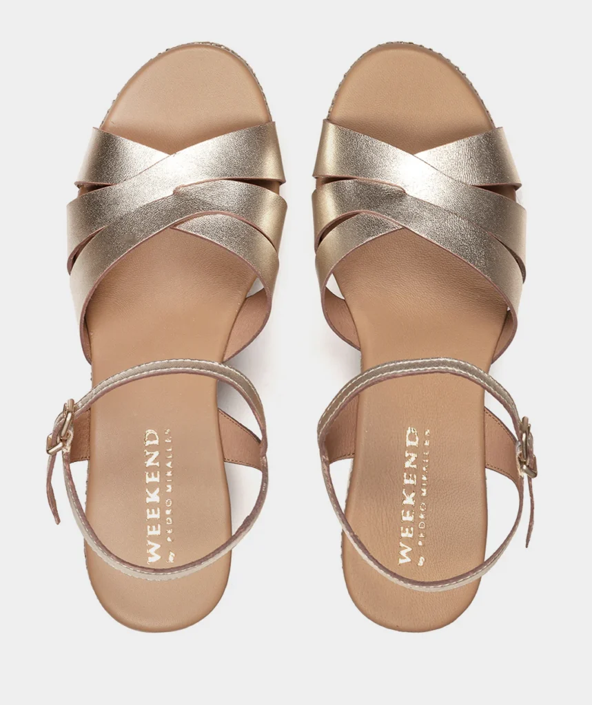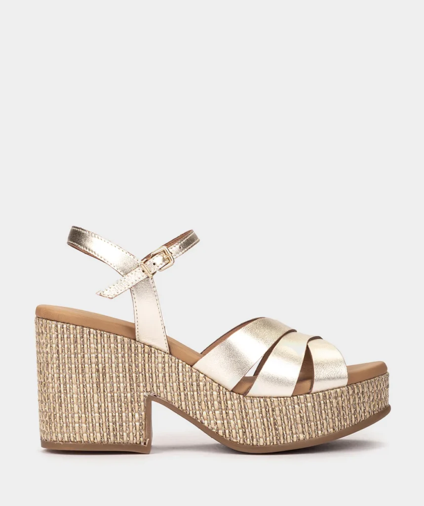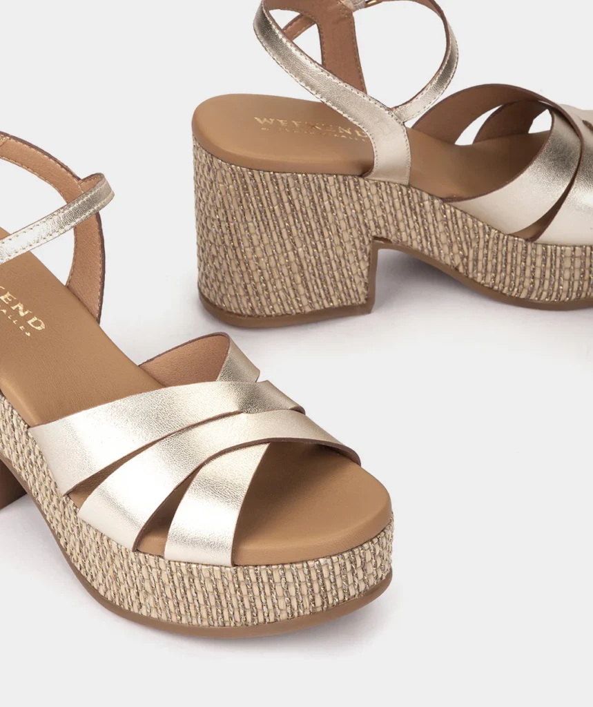 Sandalias de tacón de piel metalizada platino con plataforma de rafia Altura tacón: 8 cm. Altura plataforma: 4 cm.